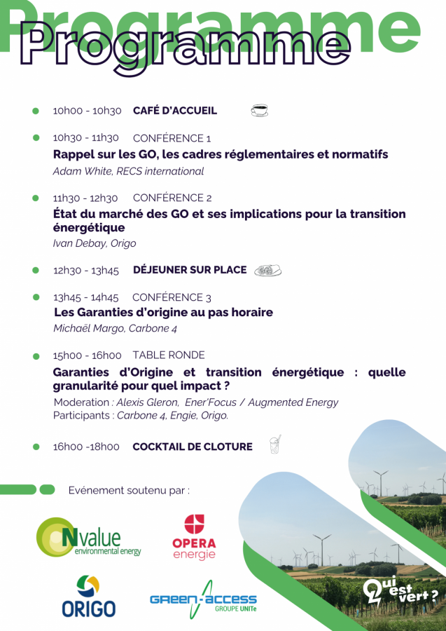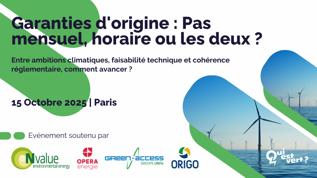 Compte tenu des enjeux actuels, QuiEstVert invite les acteurs et décideurs du secteur à se réunir le 15 octobre 2025 à Paris pour une journée de séminaire dédié à la granularité des Garanties d’Origine. Ensemble, nous dresserons un état des lieux des débats en cours sur les différentes approches (mensuelle, horaire, ou mixte) et leur impact sur la traçabilité de l’électricité renouvelable. Nous examinerons également les implications techniques, économiques et réglementaires de ces choix, ainsi que leur rôle dans l’accélération de la transition énergétique.